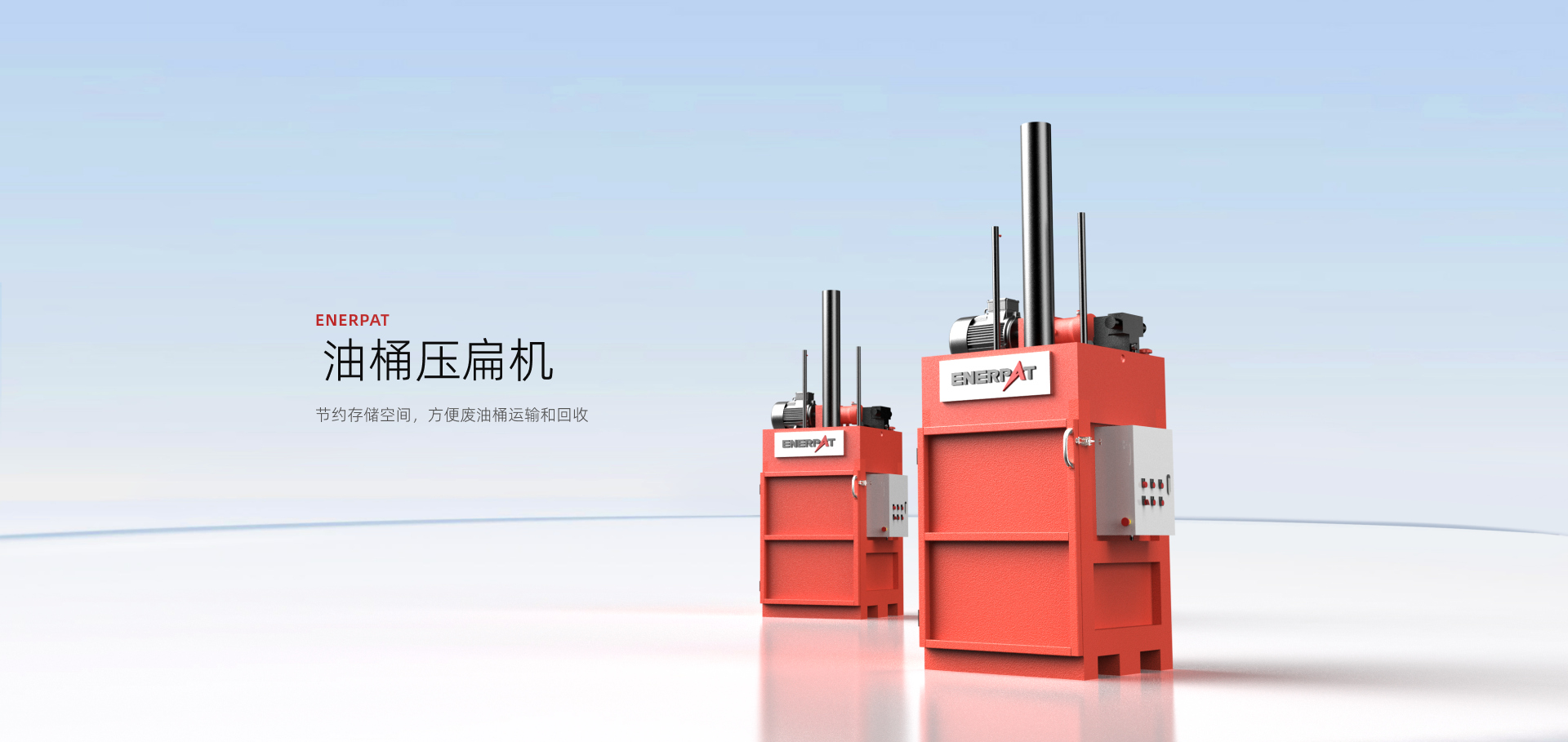 通過液壓原理將空的廢油桶擠壓壓扁,達到減少體積、節(jié)約存儲空間、方便運輸和回收的目的。